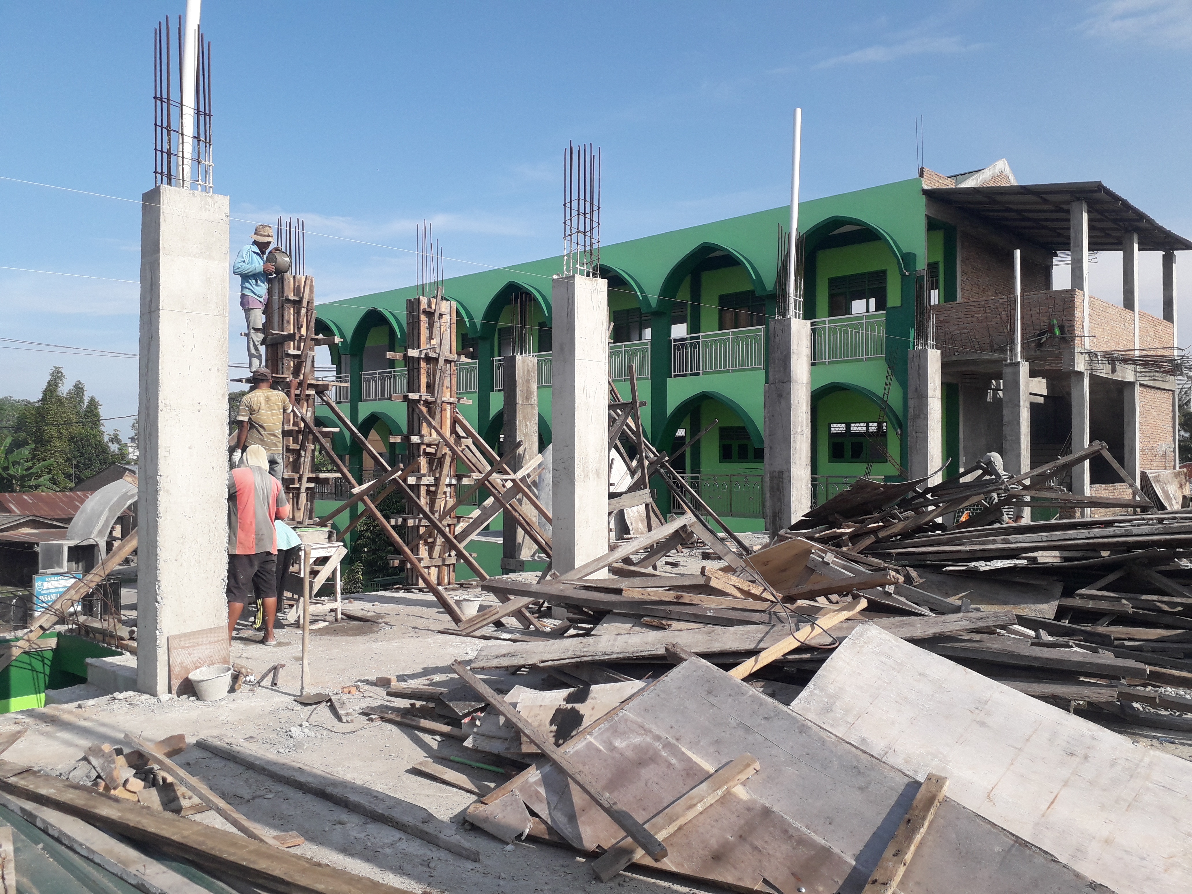 Senin 21 September 2020 Pak Wondo dan 3 orang tukang lainnya mulai membereskan tapak kerja di lantai 2 gedung tengah MIS Al Washliyah Insanul kamil. gedung tengah dimaksud adalah gedung yang telah dipugar menjadi pondasi untuk gedung berlantai 4 (empat). perencanaan setting ruangan di lantai 2 tersebut adalah untuk dua ruang kelas ukuran 7 m x 8 m, satu raungang kantor administrasi dan ruang guru ukuran 8 m x 11 m dan 1 ruangan kamar manadi ukuran 3,75 m x 8 untuk 6 bilik WC.